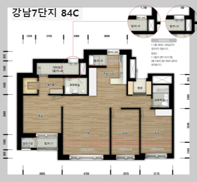 현재 분양하는 아파트들의 84타입 거실 평균 치수가 4500정도 되는데 강남7단지는 4700이다.
