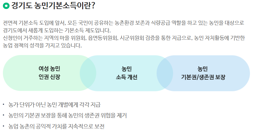 농민 개인에게 각각 지급하는 경기도의 새로운 기본소득 정책입니다.