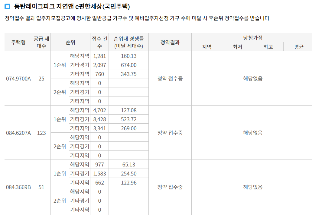 최고경쟁률 74a타입 기타 경기 674대 1, 최저경쟁률 84b타입 당해 65대 1