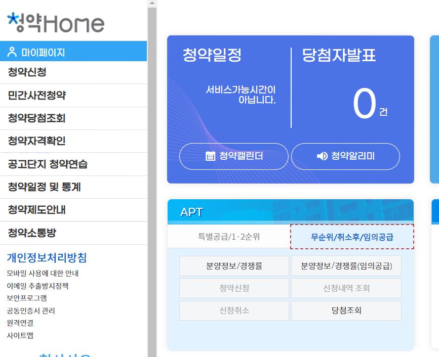 청약홈 홈페이지 접속 후 ▶️ 무순위/취소후/임의공급 클릭 ▶️분양정보 경쟁률