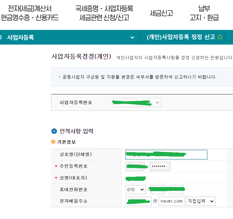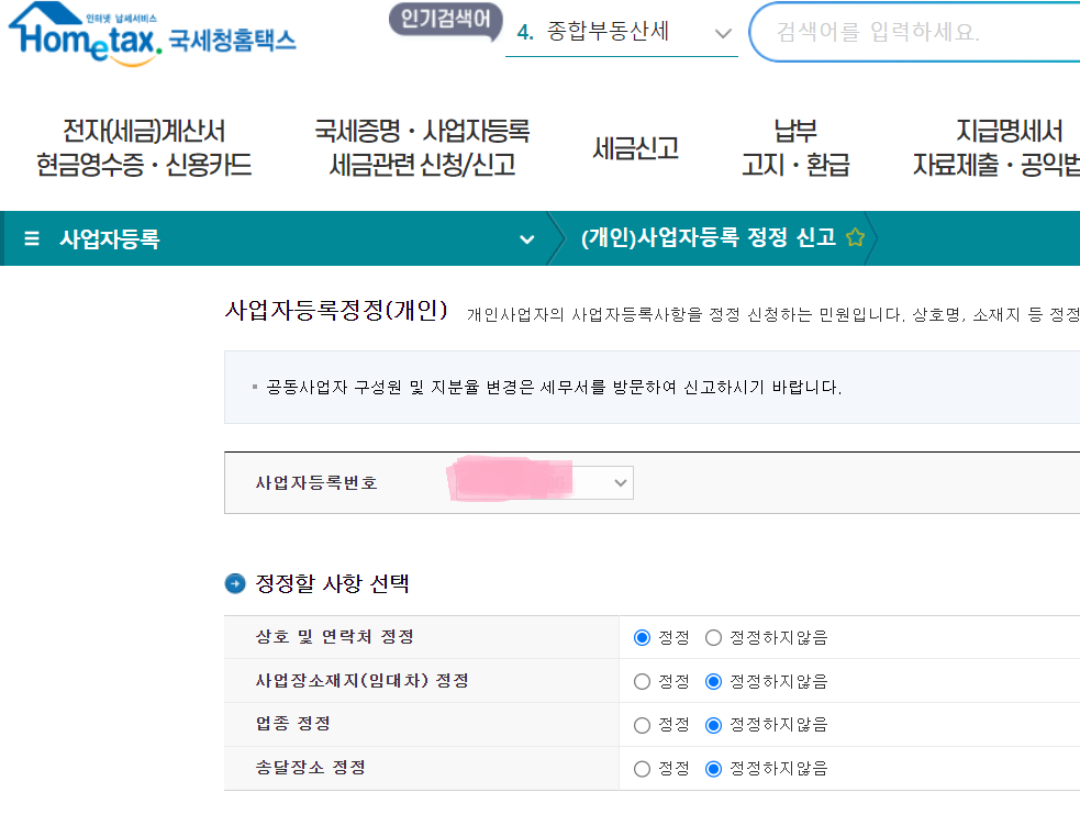 3) 사업자 등록증 중 정정할 사항을 클릭한다