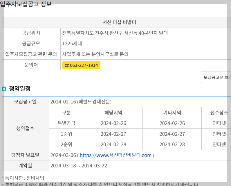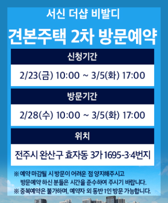 전라북도 전주에 공급하는 아파트로 1200세대 이상의 대단지와 다양한 평형으로 주목을 받고 있다. 59 타입부터 120 타입까지 다양한 타입이 공급되며 84 타입이 가장 많이 공급될 예정이다. 입주자모집공고일은 24년 2월 16일이며, 최저가격 3억7천만원대부터 최고가격 7억 4천만 원으로 당첨자 발표는 24년 3월 6일 예정이다. 입주예정일은 26년 11월이다. 층별 동호수별 세부 공급금액은 아래 입주자 모집공고문을 확인하자.