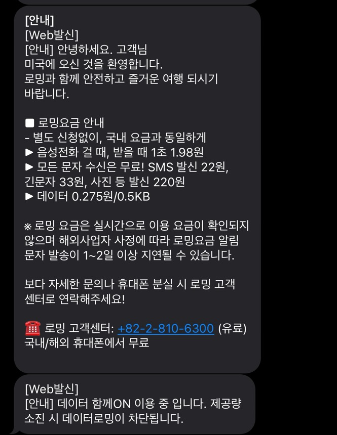 ✔️미국 로밍 통화/문자 요금도 아래서 설명해드리겠습니다.