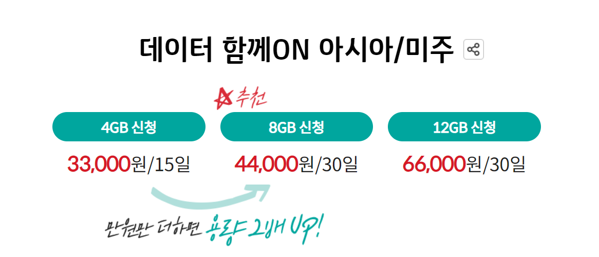 저는 미국 일주일 기준으로 8GB를 신청했습니다. 제일 져럼한 4기가를 신청하고 싶었으나, 미국 첫 방문으로 어찌 될지 모르는 상황에 만원 더 비싼 요금제를 선택했습니다.