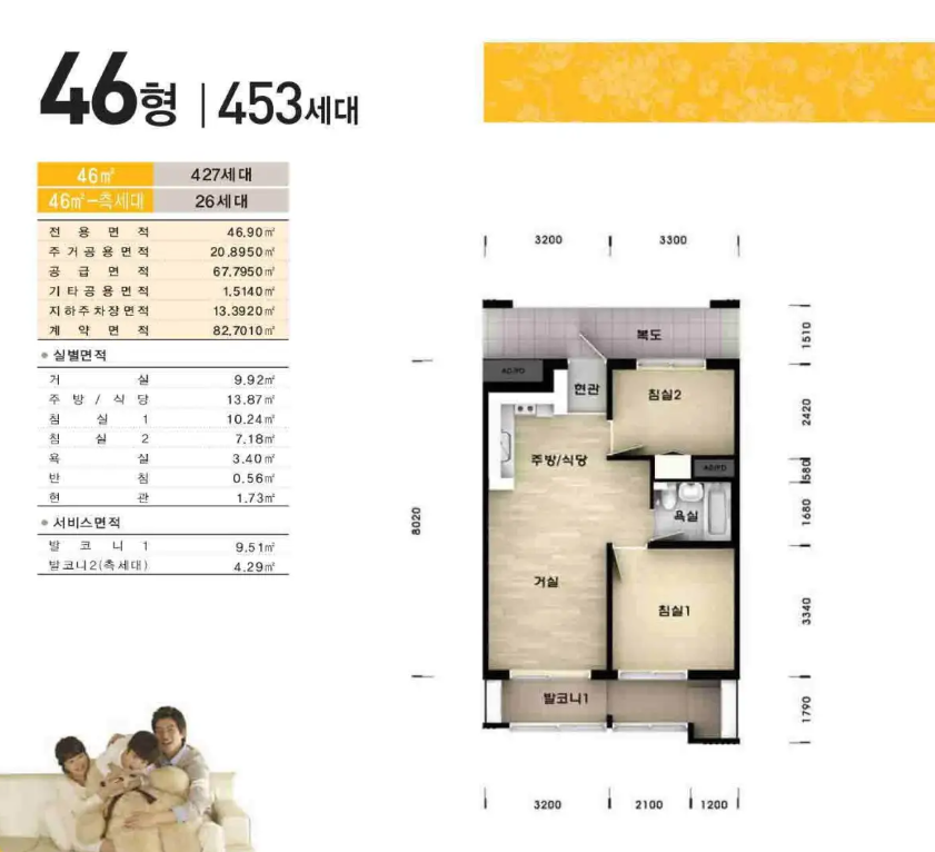 46형은 20평입니다. <방2, 거실1, 주방1>