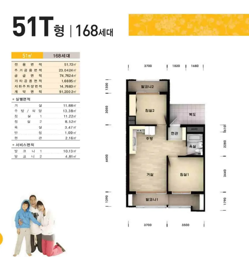46형은 20평입니다. <방2, 거실1, 주방1>