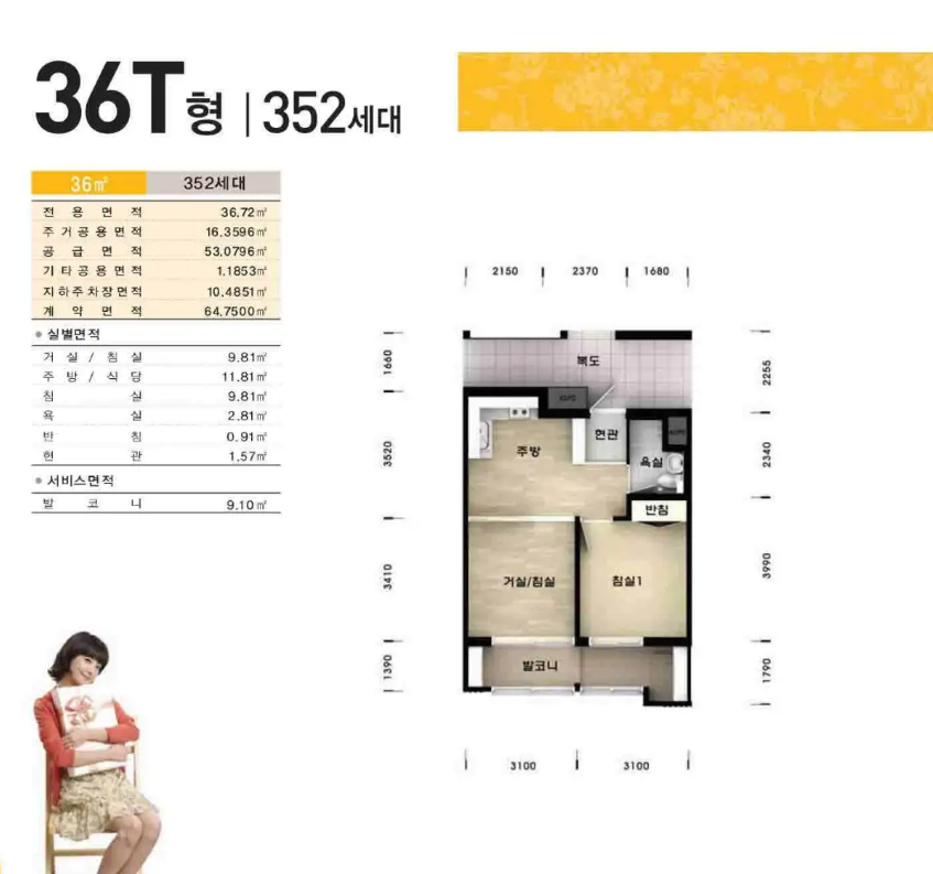 36형은 16평입니다. <방1, 거실1, 주방1>