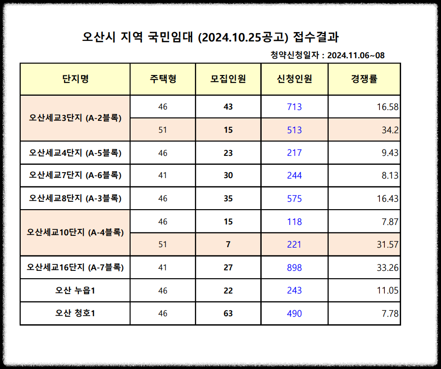 아래는 오산시 8개의 국민임대아파트 청약 접수결과입니다. 11월중 서류제출자 명단이 발표되며 12월 초 최종 당첨자가 발표됩니다. 이번 입주공고는 선입주 후검증으로 25년 2월 입주예정입니다.
