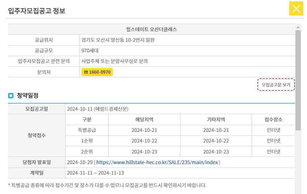 2024년 10월 오픈된 오산시 양산동 <힐스테이트 오산더클래스> 입주자 모집 공고문입니다.