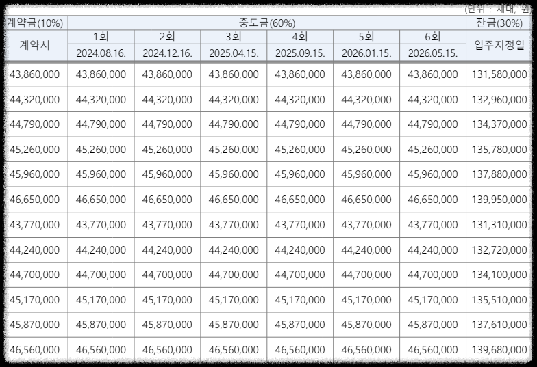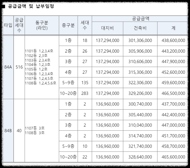 전 타입 84타입으로 32평이며 최고가층 기준 4억6천대이다. 현재 청약을 하려면 계약금 10%와 옵션 및 확장비용 10%가 필요하다. 대략 5천만원