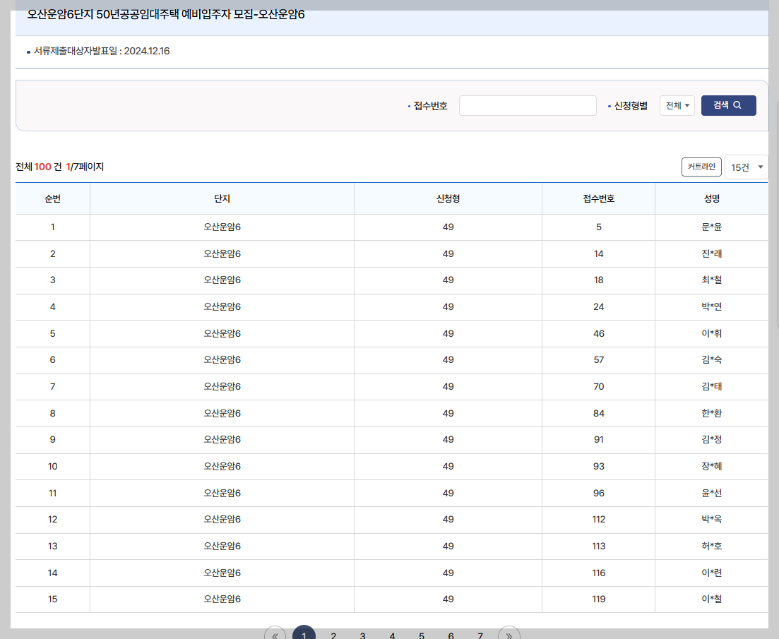 입주 예비자를 50명 뽑는 공고문이었으며, 총 100명의 서류당첨자들이 선발되었습니다.