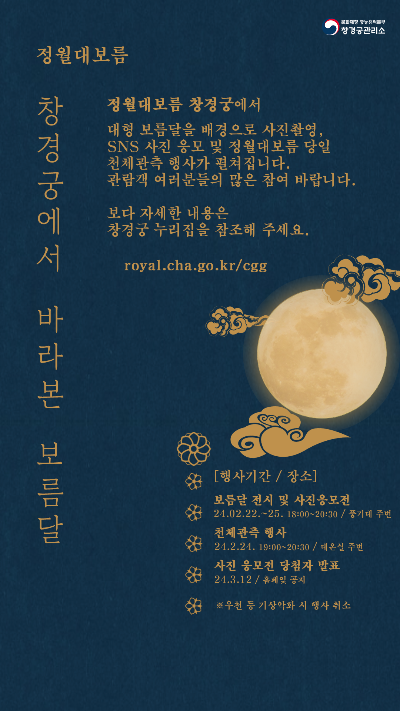 정월대보름을 맞이하여 창경궁에서 대형 보름달을 배경으로 사진촬영이나 sns 사진 응모 및 행사게 열린다. 보름달 전시 및 사진 응모 전은 2월 22~25일 18시부터 20시30분까지 풍기대주변이며, 전체관측 행사는 대온실 주변이다. 사진 응모전 당첨자는 3월 12일에 홈페이지에서 발표한다. 우천 등 기상 악화시 행사는 취소된다.