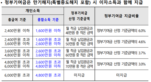 📝정부 기여금은 만기해지(특별중도해지 포함)시 이자소득과 함께 지급한다.