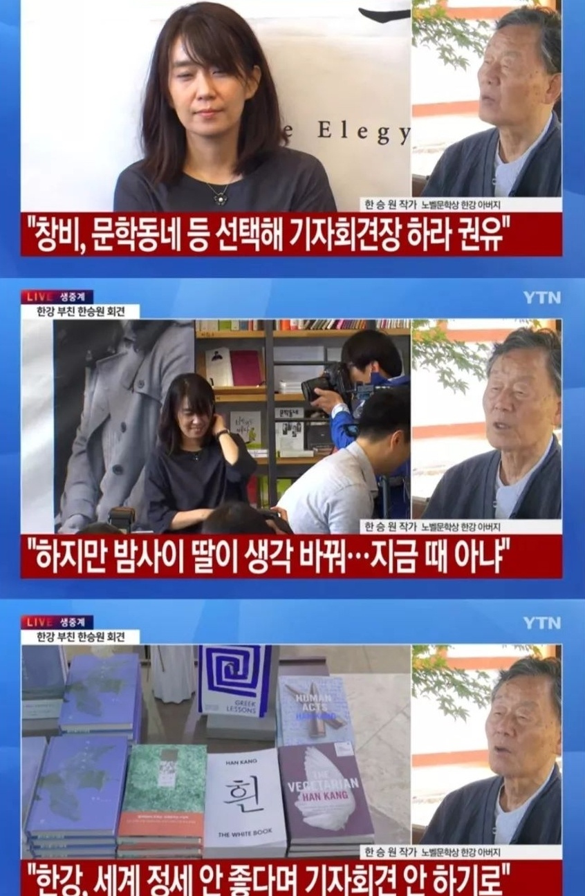 한강작가는 현재 러시아 우크라이나, 이스라엘 팔레스타인 전쟁이 치열하고 날마다 시신이 실려 나오고 있는데 잔치를 벌인 것처럼 기자회견을 하는 건 아닌 것 같다고 한다.
