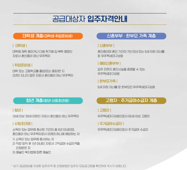 주택 공급신청자는 성년자(자녀를 부양하거나 직계존속의 사망, 실종신고 및 행방불명 등으로 형제자매를 부양하여야 하는 세대주인 미성년자를 포함)인 무주택세대구성원을 말하며 단, 대학생, 청년, 예비신혼부부, 한부모가족은 성년자가 아닌 경우에도 신청 가능합니다.